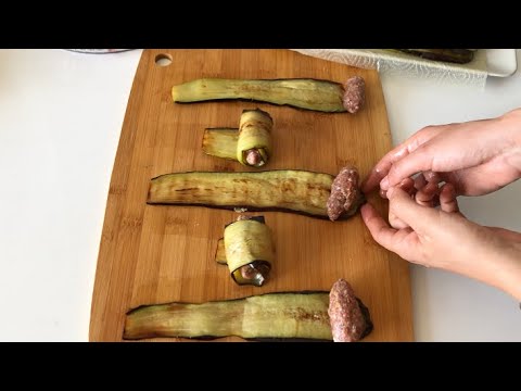 Kızaran patlıcan ve kabağın geniş kısmına köfte konulur ve sarılır.