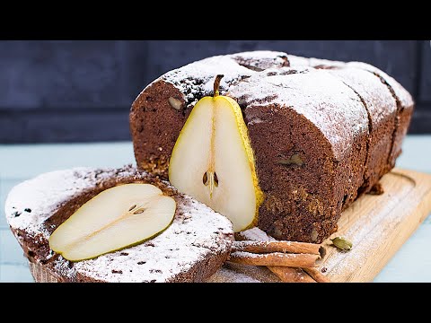 Mix flour with cocoa powder, baking powder, and walnuts. Add in grated frozen butter, eggs, and cream. Mix the batter well. Peel pears and sprinkle them with cane sugar and cinnamon.
